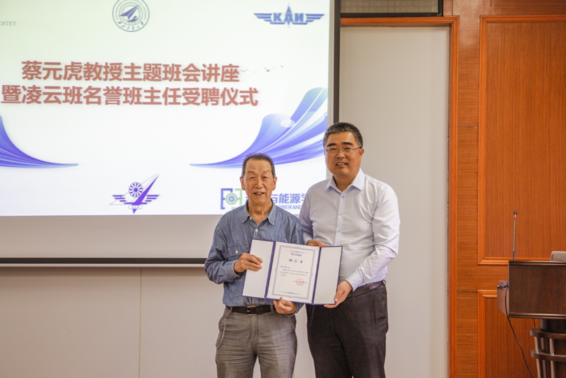 老院长蔡元虎教授为凌云班名誉班主任,并向蔡教授颁发聘书和凌云班班徽。