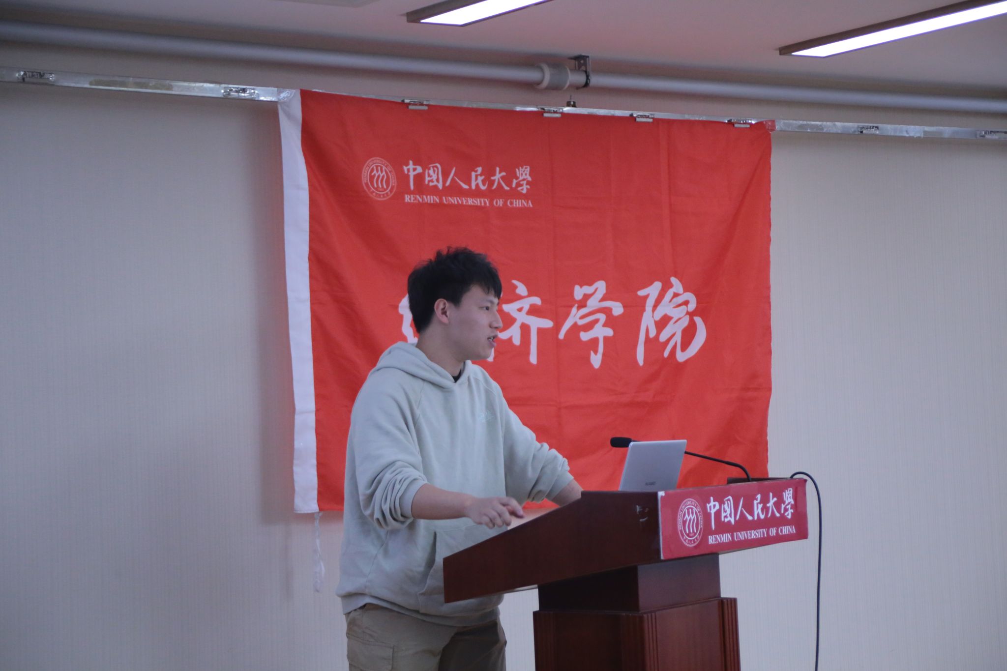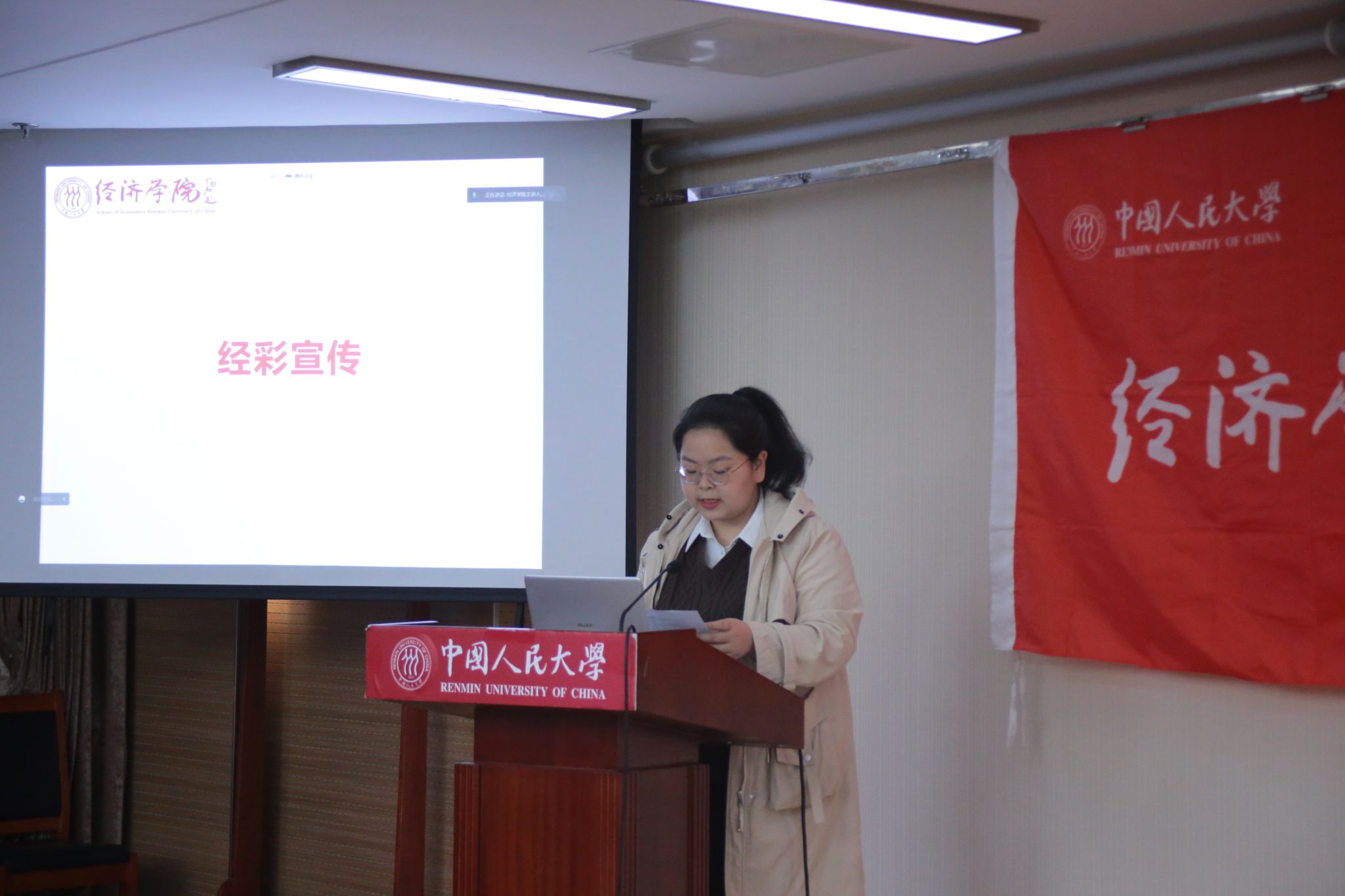 随后,中国人民大学经济学院学生会执行主席赵培涵同学介绍了中国人民大学经济学院学生会组织情况和学生工作开展情况。从经彩组织、经彩权益、经彩宣传、经彩志愿、经彩学术、经彩文体六个方面介绍了经济学院学生会的各项工作。全面详细地讲述了一支既有活力、又有担当、更有战斗力的队伍。
