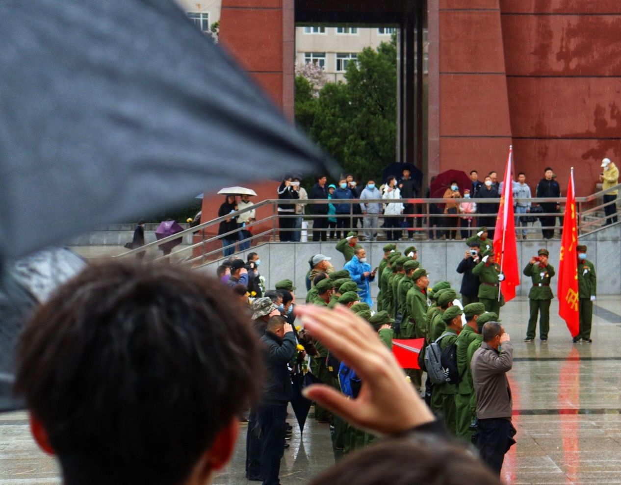祭奠现场,一队身穿老款军装的退役老人亦前来缅怀。学院青年纷纷停下脚步,与老革命家们一同向纪念碑敬礼。
