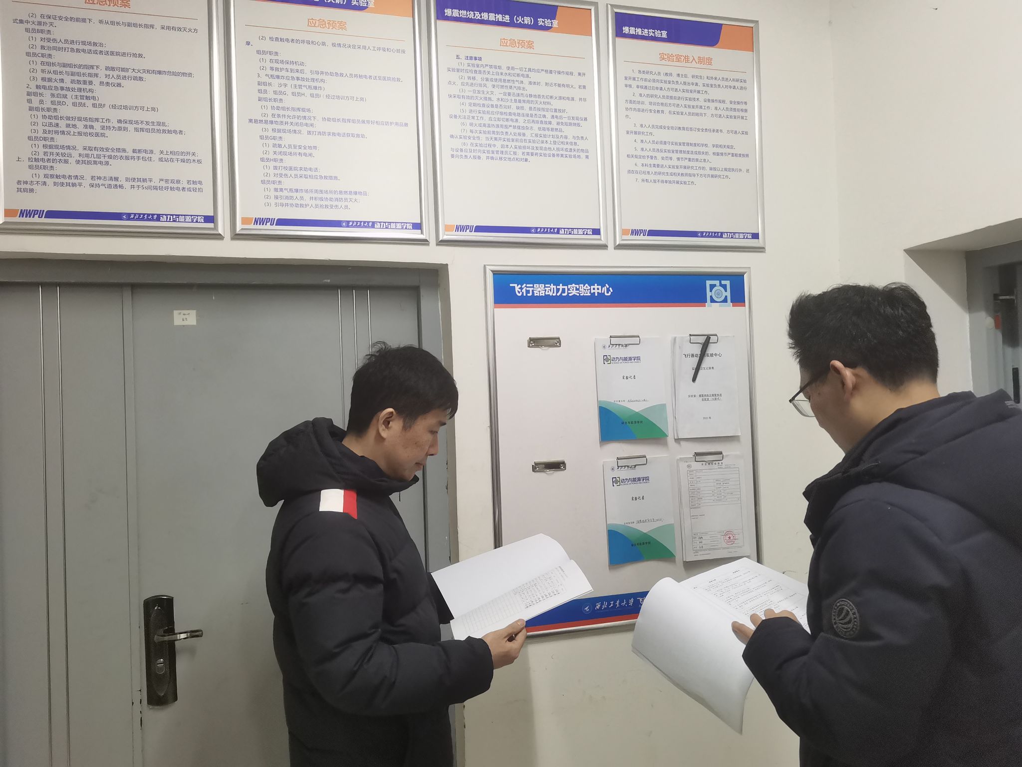首先,安全检查小组到爆震推进实验室、燃烧实验室、叶栅实验室、先进航空动力润滑与空气系统实验室、动力机械寿命及可靠性实验室、传热及冷却实验室、吸气时高超声速推进系统实验室和通航/无人系统动力工程中心进行了检查,重点围绕实验室的危险源进行了安全检查。检查了实验项目风险评估报告、实验记录登记、危化品使用台账、特种设备管理、以及实验室的日常管理情况。检查中高文君对学生强调,要从思想上提高安全意识,开展实验前一定要考虑到实验中潜在的安全风险,熟悉应急预案,不清楚的多向老师请教,实验过程中一定要做好相关区域内的警戒,确保人员安全和设备安全。
