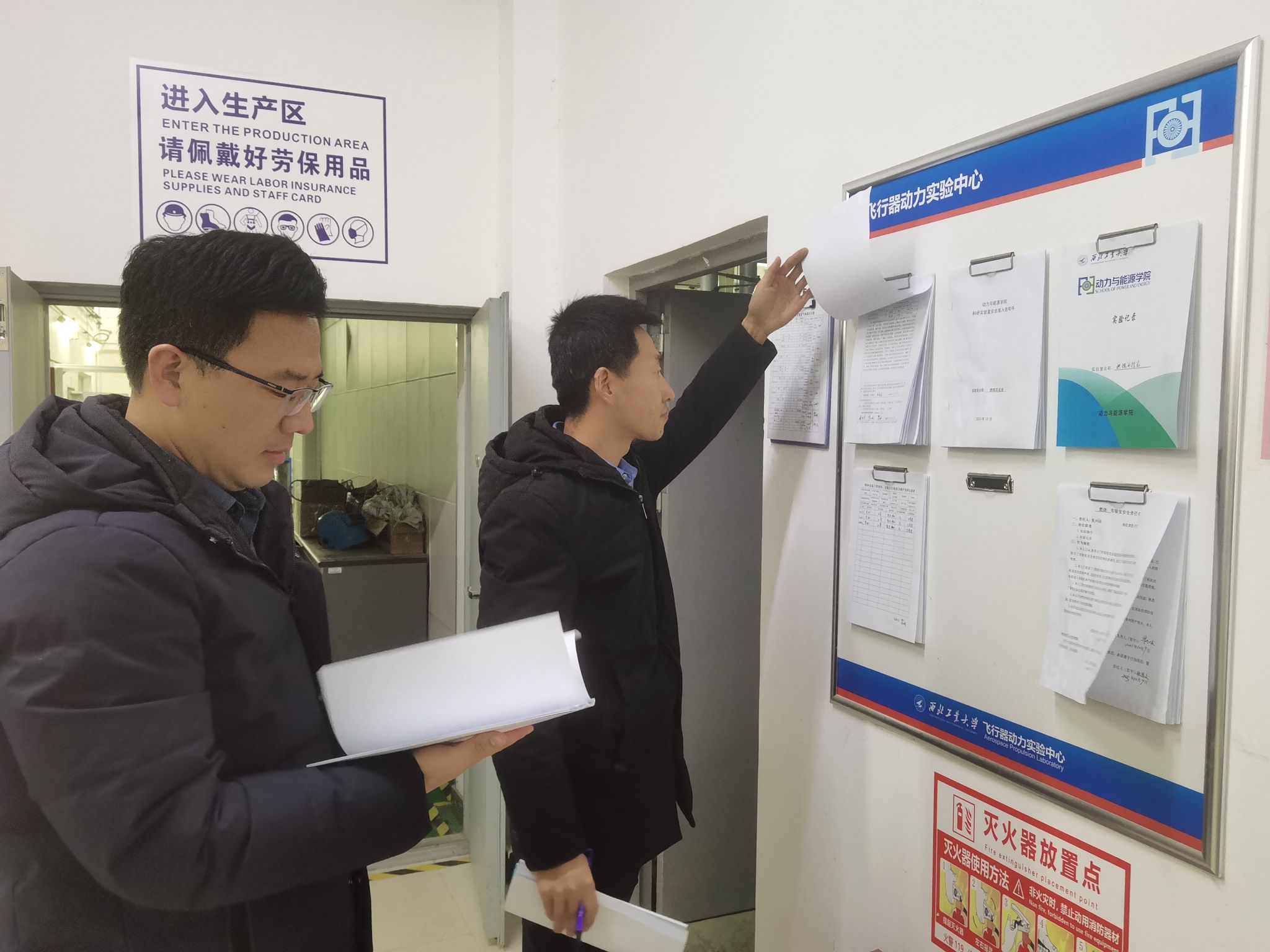 其次,检查小组对飞行器动力实验中心园区内的重点安全部位进行了检查,查看了园区地下燃油存储罐、公共气源站、楼宇内的消防设施、安全应急逃生通道、应急物资存储柜等设施和设备的配备和管理情况。