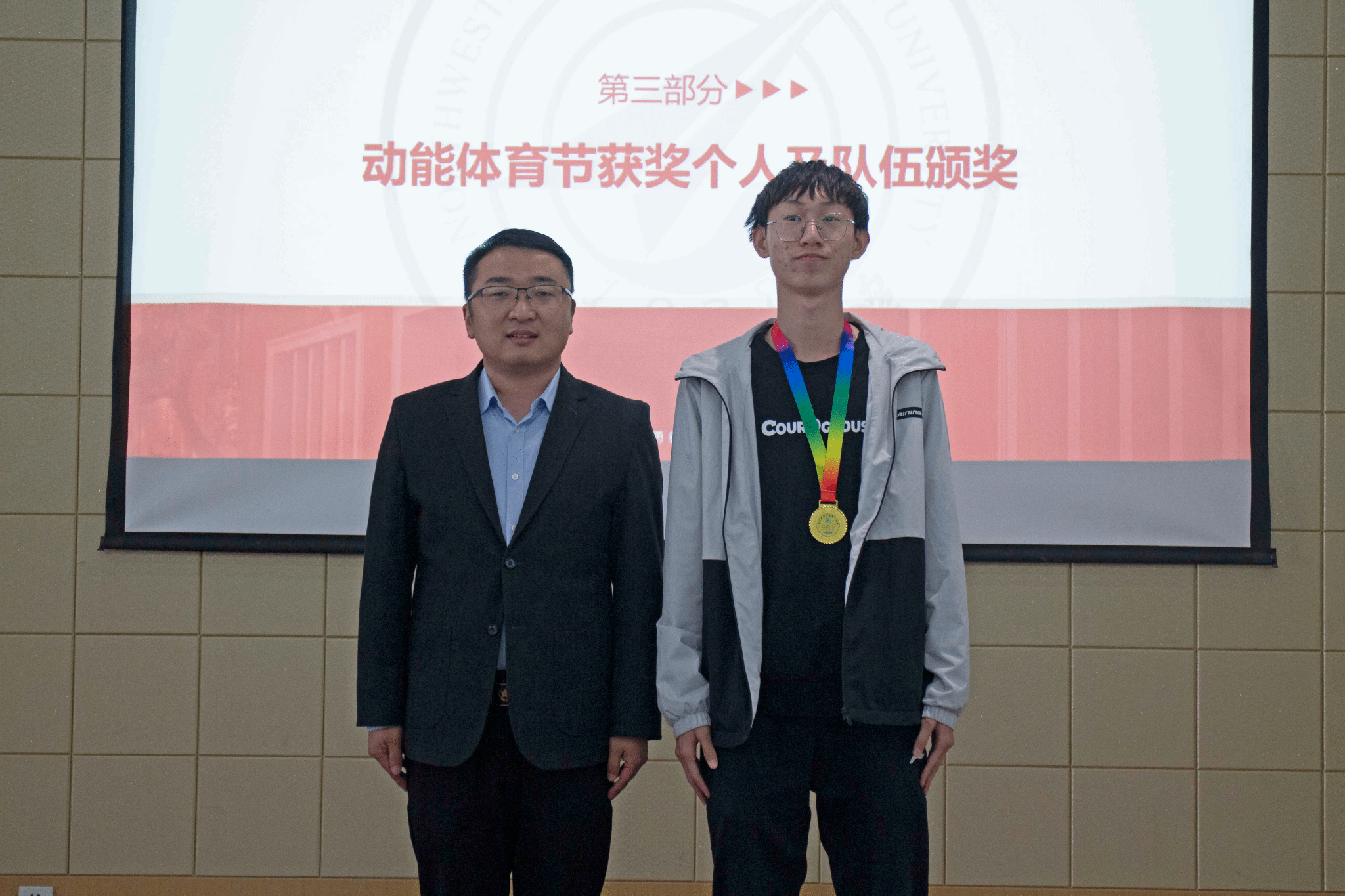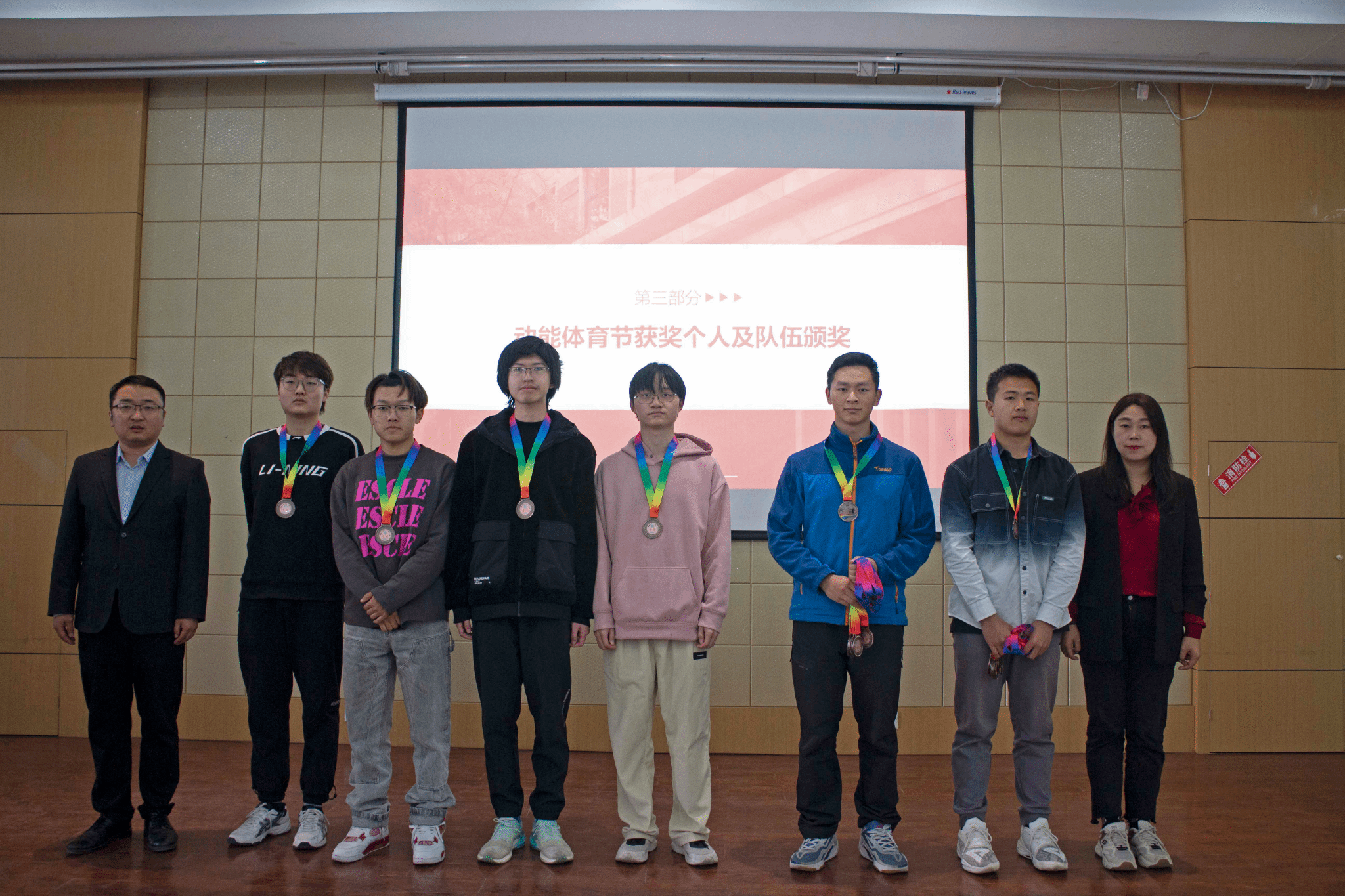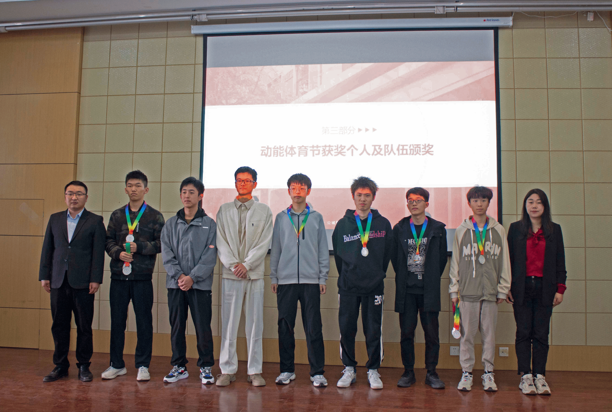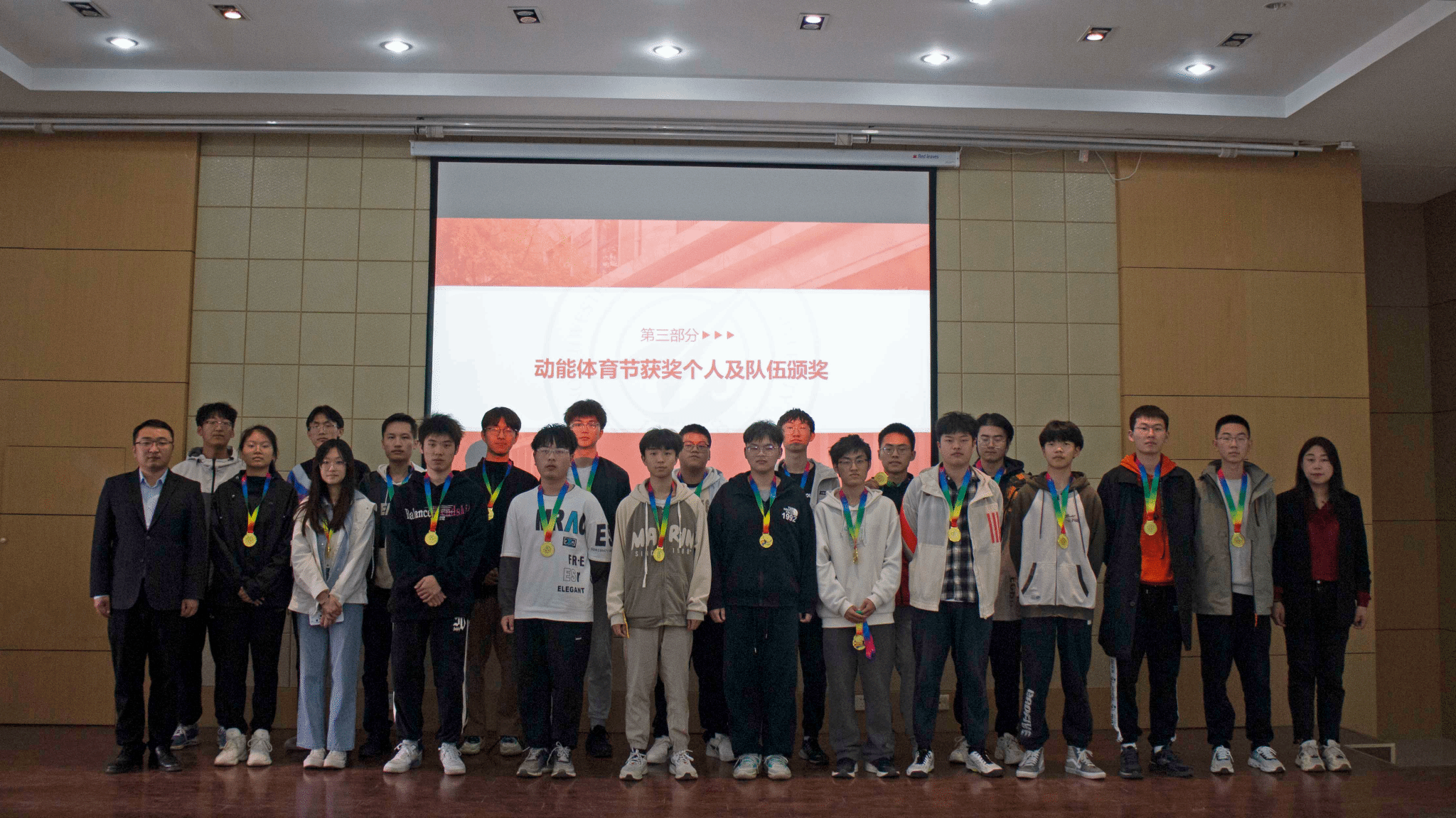 大会第三项,由徐永超老师、姜倩老师为动能体育节获奖个人及队伍颁发奖牌并合影留念。