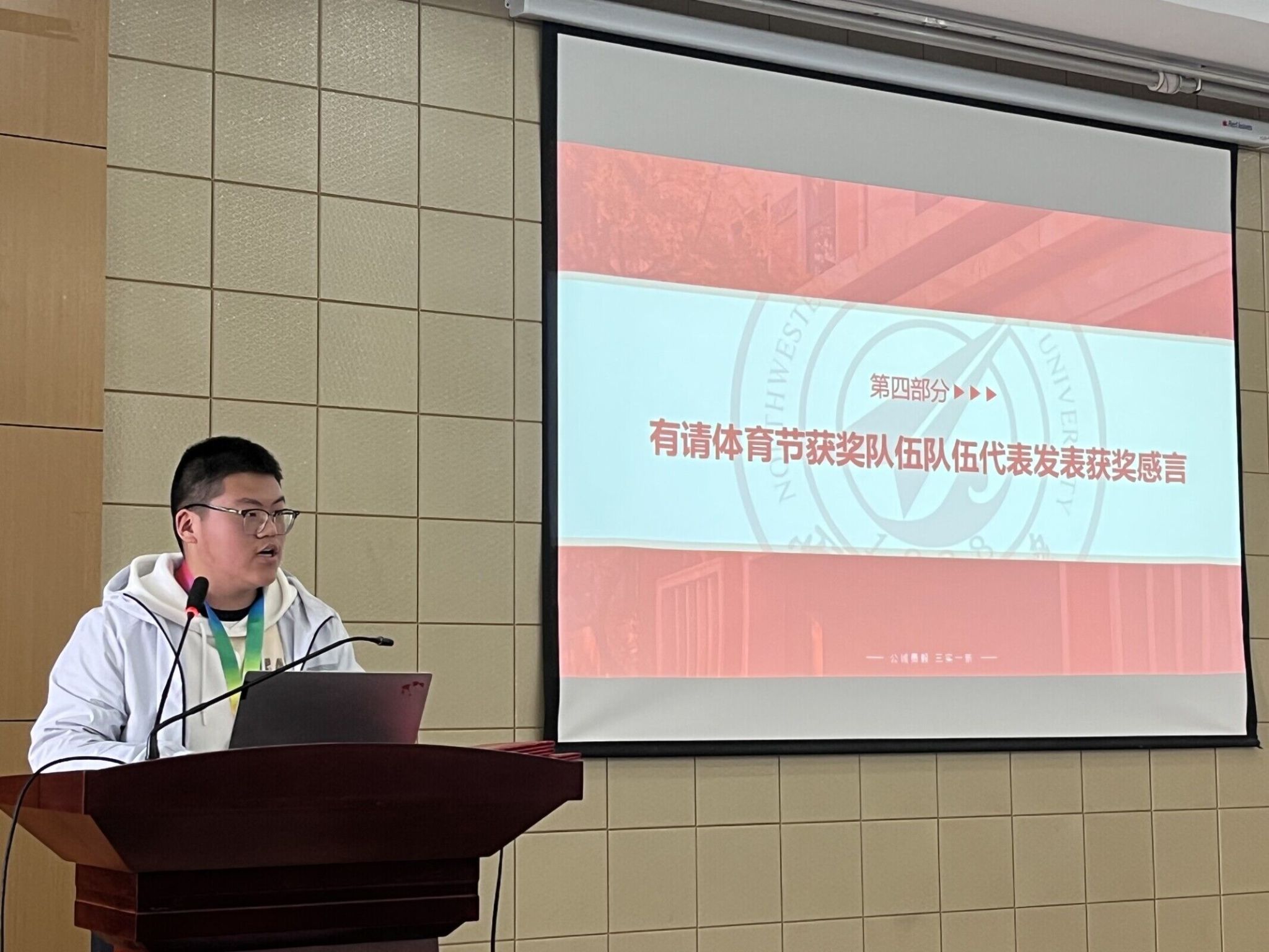 大会第四项,动能体育节获奖队伍代表徐帆帆同学登台发表获奖感言。徐帆帆同学感谢学院的支持和学生会同学们的付出,为热爱体育的同学们搭建了动能体育节这一良好的交流平台。他提到,在准备及参赛的过程中,同学们在团队协作中逐渐培养默契,更深刻体会到团结的重要性。最后,徐帆帆也鼓励大家积极参与体育活动,强健个人体魄,充实课余生活。