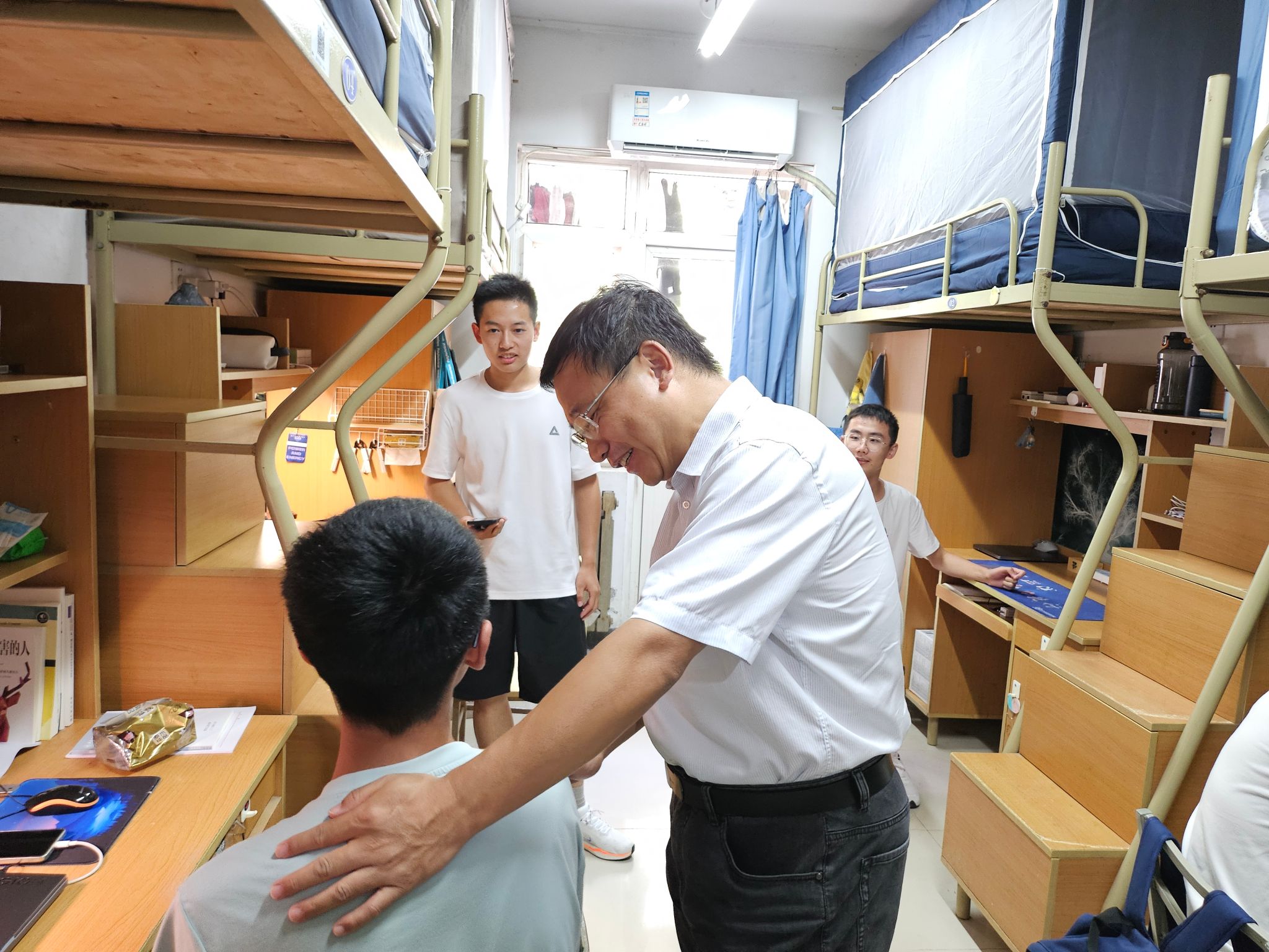 9月3日,王占学书记,刘存良院长,徐永超副书记和张钰凡辅导员来到24级本科新生宿舍,走访慰问了刚踏入大学校园的本科新生们。走访中,刘院长表示,大学是人生崭新的一堂课,期望新生同学们在校园里不仅能练就一身过硬本领,更能学习隐姓埋名,为国铸剑的高贵精神。王占学书记亲切地从多层次多角度与新生展开交流,新生们也与书记分享交流了初入西工大自己的所见所闻所感,和对未来四年的大学生活的期盼与向往。