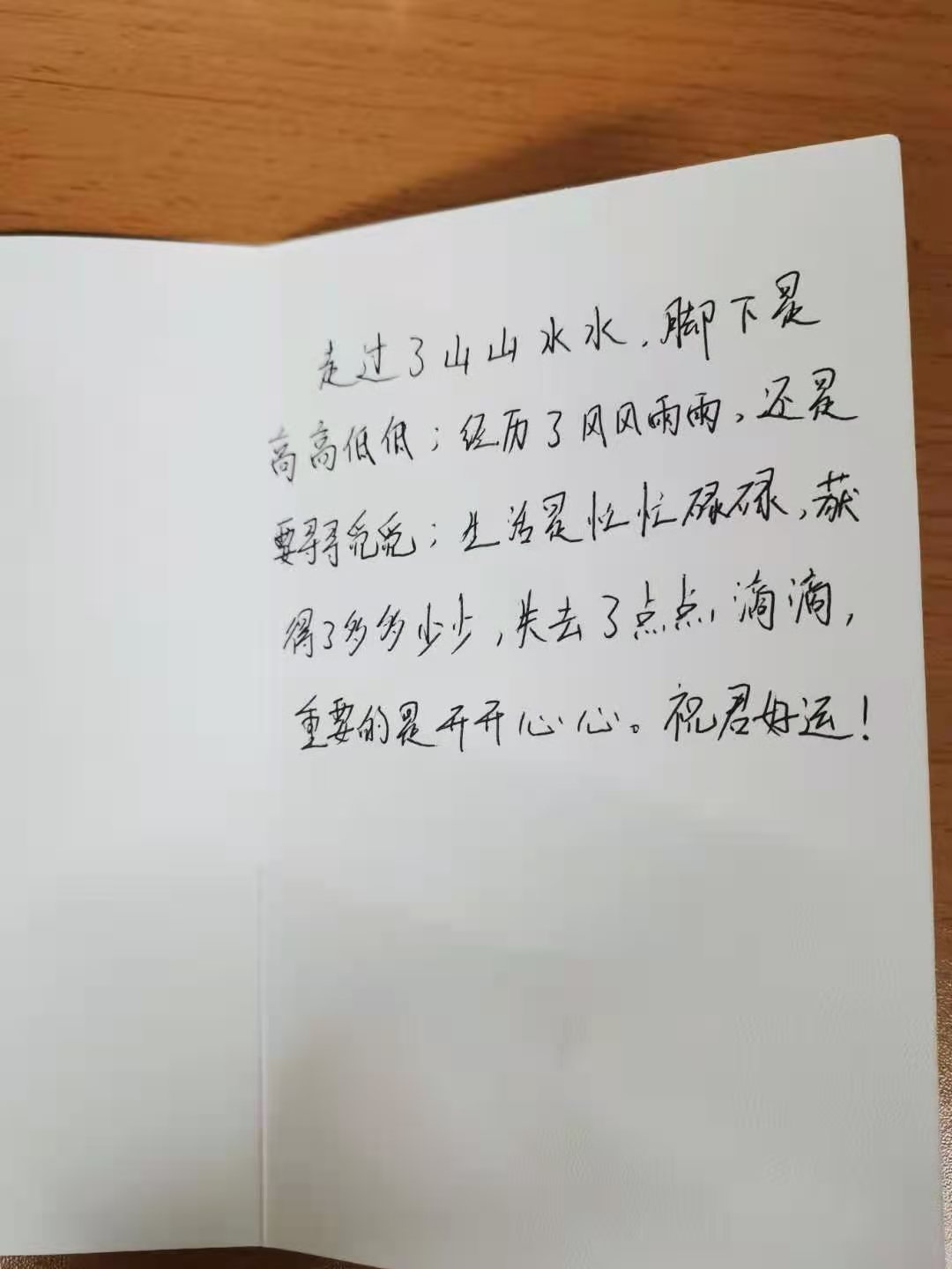 “走过了山山水水,脚下是高高低低;经历了风风雨雨,还是要寻寻觅觅;生活是忙忙碌碌,获得了多多少少,失去了点点滴滴,重要的是开开心心。祝君好运!”