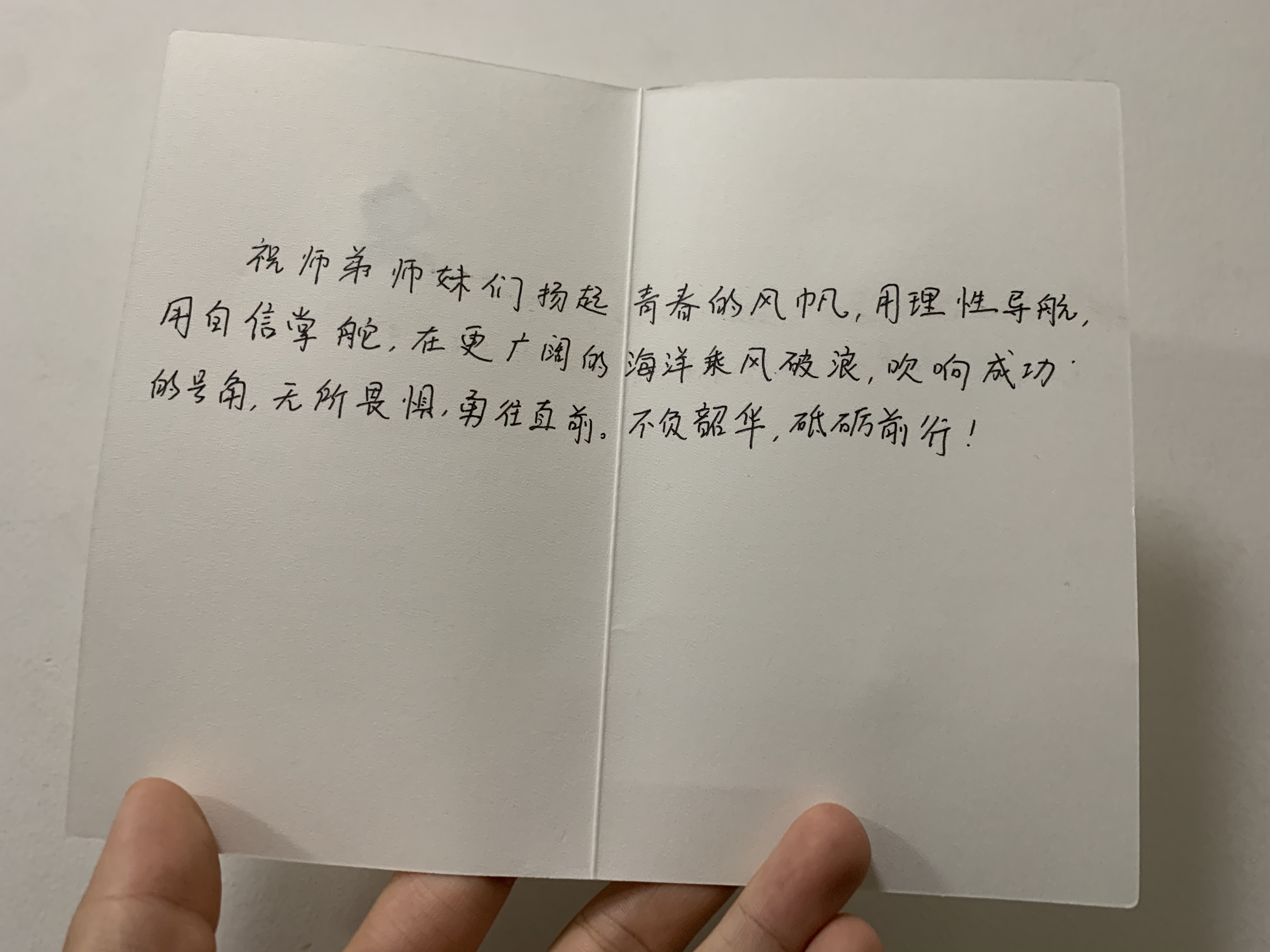 “祝师弟师妹们扬起青春的风帆,用理性导航,用自信掌舵,在更广阔的海洋乘风破浪,吹响成功的号角,无所畏惧,勇往直前。不负韶华,砥砺前行!”