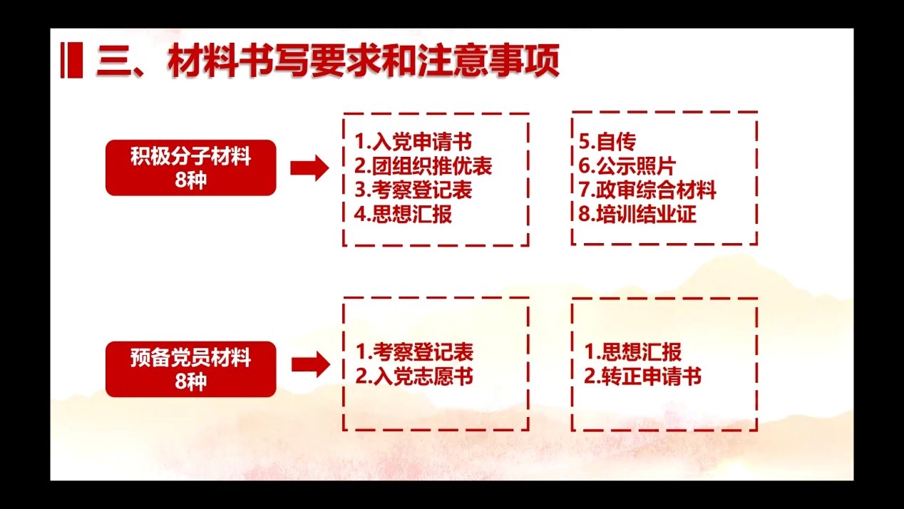 接着,张老师为同学们带来了党员发展中需要填写的党员材料中的要求和注意事项,张老师从自身工作经验出发,为同学们讲解了很多易犯的错误,真实地为学院后续学生工作减少了相应的负担外,也充分引起了学生关于材料填写的注意事项。