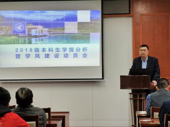召开党政联席会议专题布置学风建工作,立足学风建设,聚焦立德树人根本任务。11月16日下午,学院党委书记闫育周在学院楼225会议室给2018级学生班干部上了一堂以改进学风为主题的思政课。学院党委副书记刘江、2018级本科生辅导员和班主任共同参会。