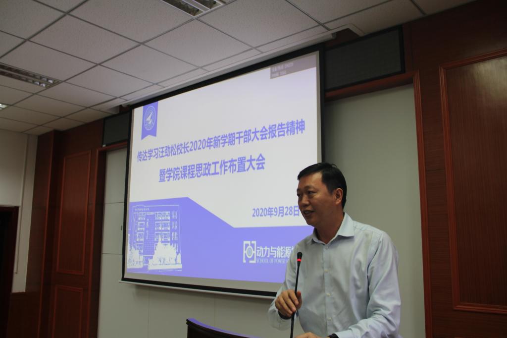 首先,王占学做了题为《以课程思政为抓手,强化三全育人意识,构建动能特色的“三位一体”的育人体系》的报告,从“课程思政与人才培养间的内在联系、学院人才培养与课程思政建设分析和落实学校思政课程与课程思政协同育人工作的具体举措”三个方面解读了学院人才培养模式和课程思政协同育人的举措。他强调,学院将全力开展150+X的专业培养方案模式,用150学分内的学习初步夯实专业基础,使学生具备从事行业工作的基础专业知识和基本工作能力,把班主任和本科生导师制作为这一部分工作的主要抓手,加大班主任和本科生导师的考核力度;用X所代表的“塑魂”、“强基”、“益智”、“健体”、“拓维”为主线,强化人才培养工作中的价值塑造和能力培养,全面提升学院人才培养综合能力,提高人才培养质量。