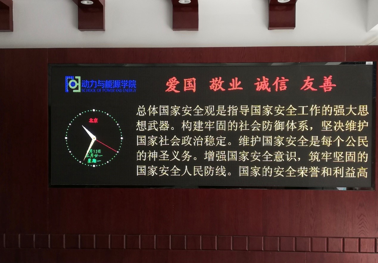 3、 学院LED显示屏宣传全民安全口号。告诉人民国家安全的根基在人民、力量在人民、血脉在人民,国家的安全荣誉和利益高于一切,维护国家安全是每个公民的神圣义务,他将有力的提高师生国家安全意识。