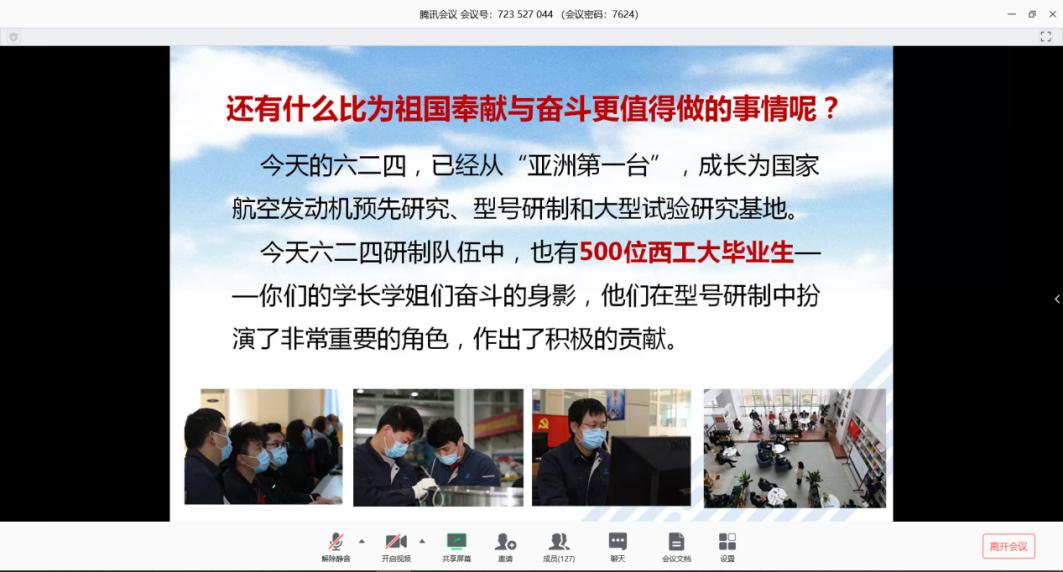 课上,吴忠跃书记从吴大观、董绍庸、刘大响等专家前辈讲起,介绍了624所的历史背景与成就,鼓励工大学子学习624所精神,发扬困难越大越有劲的精神,要勇于担当,励志把我国发动机搞上去。吴书记表示,624所近三分之一的工作人员毕业于西工大,这些同学踏实肯干,在各项重大任务中表现不凡,吴书记代表624所向西工大所有老师同学表示衷心的感谢,感谢所有老师与同学们做出的贡献,并且欢迎各位老师和同学到624所参观交流学习。授课的尾声,吴书记为大家提出了三点期望,希望大家要做起而行之的行动者,要做敢于奋斗的坚守者,要做攻坚克难的奋斗者,希望大家把西工大精神发扬,为中华民族伟大复兴奋斗,为党和人民交上一份满意的答卷。