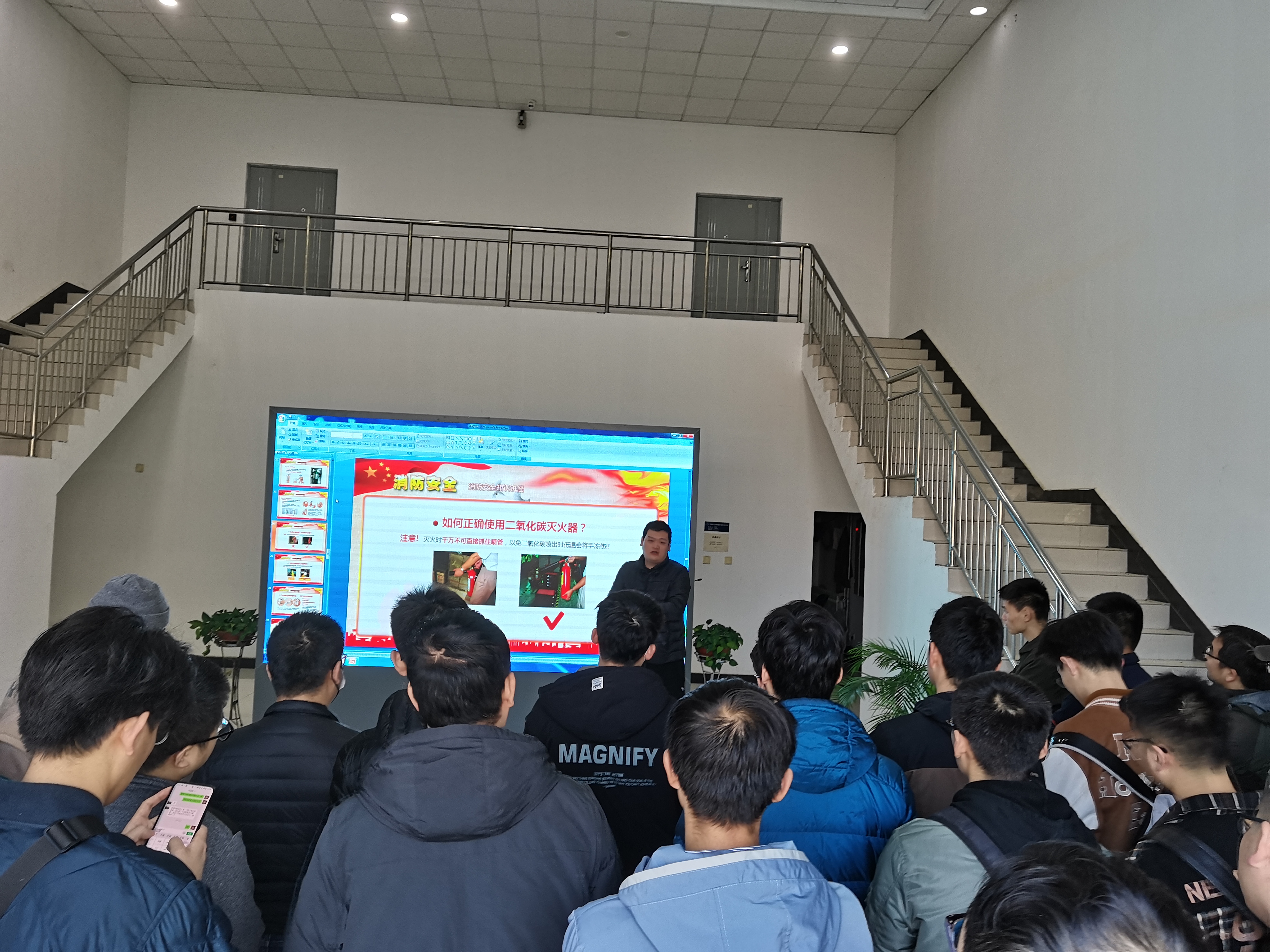 随后,学校公安处许磊老师结合安全事故案例带领在场师生学习了相关的消防安全知识。从消防基本常识,消防设备/器材标志、种类及使用方法,发生火警时的处理方法,发生火灾时自救和逃生等方面进行了详细的讲解,并组织大家观看了安全警示相关视频,让师生深刻地了解到火灾的严重危害。