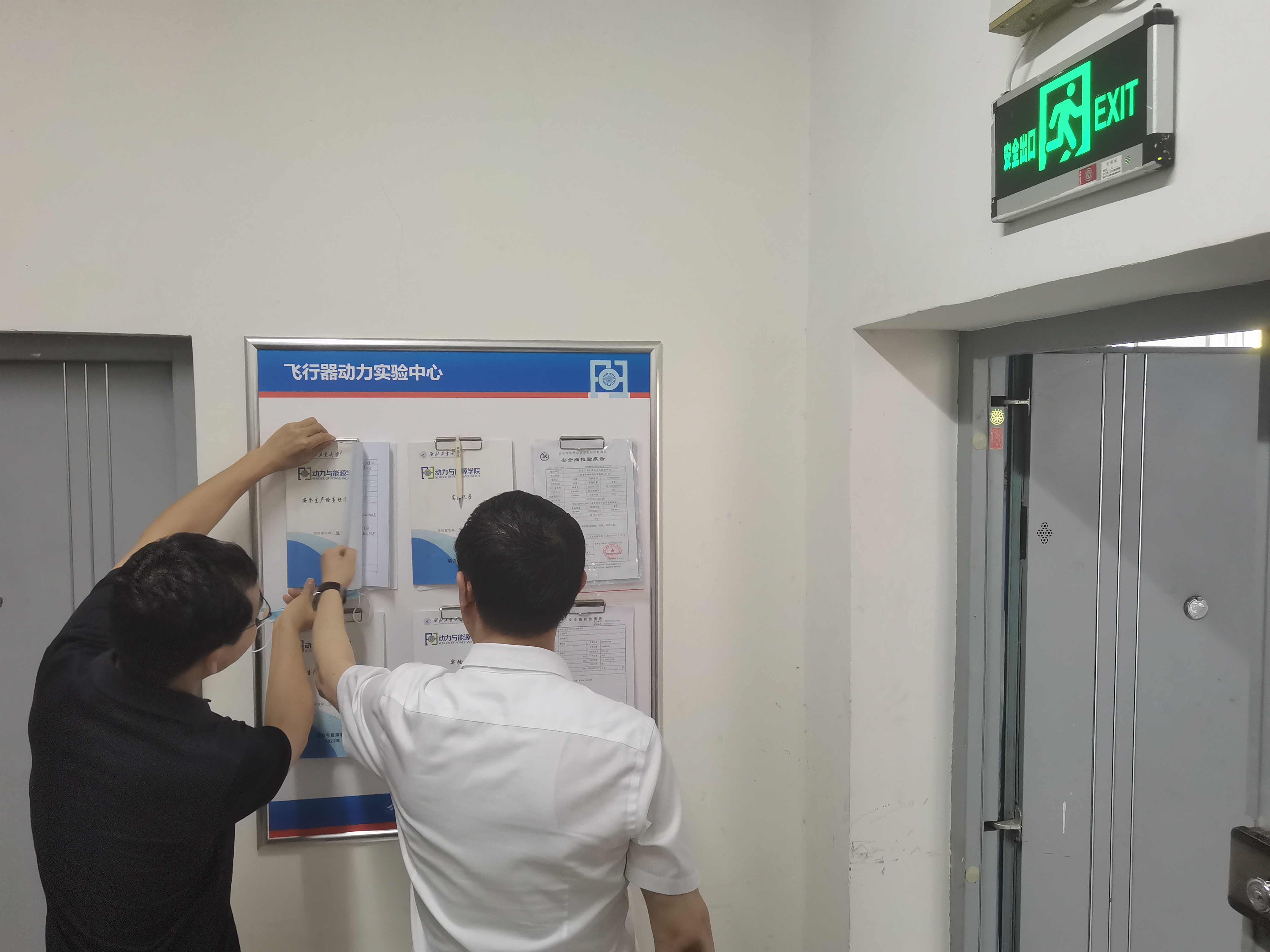 航空发动机结构动力学与故障诊断实验室、燃烧实验室、叶栅实验室、爆震推进实验室进行了安全检查,查看了实验室的规章制度、实验记录、培训记录、危化品等方面,重点检查了实验室现场的应急预案、安全防护设施、特种设备、消防器材。