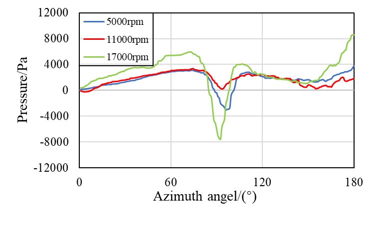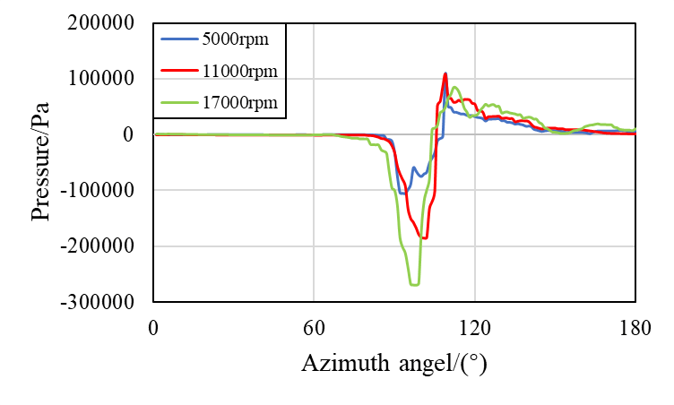 数值计算结果表明当滑油通过供油孔进入轴承时,它在球体的底部产生旋涡,然后沿着球体与保持架之间的间隙流向外环。随着轴承转速增加,轴承内流体速度也在增加,如图2所示。图3为不同轴承转速下球体表面的压力分布,轴承旋转引起的离心力导致滑油在外环附近聚集。由于球体与外环之间的间隙较小,流体速度增大,导致球体上方出现低压区。此外,内环的旋转速度大于球体公转的转速,当供油孔面向球体的底部时,滑油直接喷射到球体的表面,产生压力差,这就导致了供油孔前的低压区和供油孔后的高压区。随着轴承转速的增加,球体表面压力也在增加。从图4(a)和图4(b)中可以明显看出这一点,图4(a)为上半球的压力,图4(b)为下半球的。下半球的压差明显大于上半球的压差,当轴承转速从5000rpm增加到17000转rpm时,压差增大1.85倍。图5为不同轴承转速下球体表面的剪切应力分布,剪切应力主要集中在球体与其他部件(如内环、外环和保持架)的接触区域。环下供油孔会显著影响球体表面的剪切应力分布,从而产生更大的剪切应力。随着轴承转速增加,球体表面的剪切应力范围扩大。图6为环下供油孔面向球体底部时,由上半球到下半球360°的剪切应力。随着轴承转速增加,轴承部件的相对速度增加,导致球体表面的剪切应力增加。球体表面的压差和剪切应力形成了拖曳力,图7为不同轴承转速下单个球体旋转一周的平均拖曳力。由于滑油从环下供油孔进入轴承与内环一起旋转,因此滑油在轴承内的周向运动速度比球体公转快,导致后半球的压力比前半球大。通过分析发现拖曳力方向与球体的公转方向一致,即拖曳力是环下润滑球轴承中球体公转的驱动力,这与喷射润滑不同。当轴承转速为5000rpm时,拖曳力为0.36 N;当轴承转速为17000rpm时,拖曳力为1.47 N,增大4.08倍。