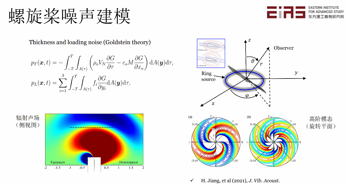 姜汉博副研究员首先讲解了气动噪声Lighthill理论、Ffowcs Williams 和 Hawkings理论及其一般应用。针对无人机螺旋桨噪声问题,他提出对于单频噪声建立理论预测模型来理解噪声产生机理和一般辐射规律,对于宽频噪声应采取高精度数值模拟方法,准确捕捉螺旋桨近壁面复杂流动发生和发展过程。此处,姜汉博副研究员提出人工可压缩性方法来研究低速流体噪声问题,既能克服传统不可压缩模型无法解析声音传播过程的缺陷,又能提高整体仿真计算效率和声学预测可靠性。