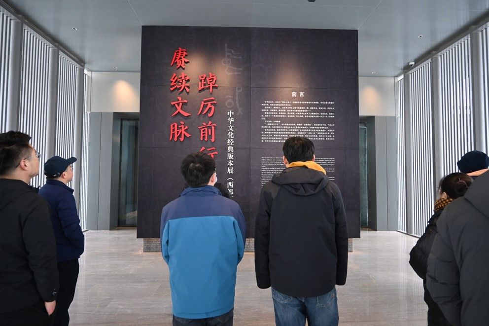 最后大家来到了《赓续文脉 踔厉前行——中华文化经典版本展(西部篇)》,分为“中华文明 民族根脉”“延安精神 红色血脉”“民族复兴 伟大梦想”三大部分,讲述了以西部为主的中华经典版本故事。展出内容涵盖了古籍,画作,竹简,拓片等有甲骨文、秦简、汉简等珍贵文物的复制品,其内容之精美令大家都叹为观止。